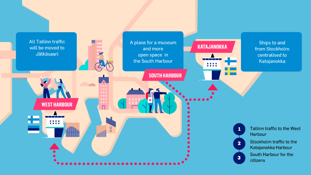 Considering this, the rearrangement program of the Port of Helsinki, which is part of the Development Program 2030, aims to reorganize harbour operations by centralizing Tallinn-bound traffic at West Harbor in Jätkäsaari and Stockholm-bound traffic at Katajanokka.