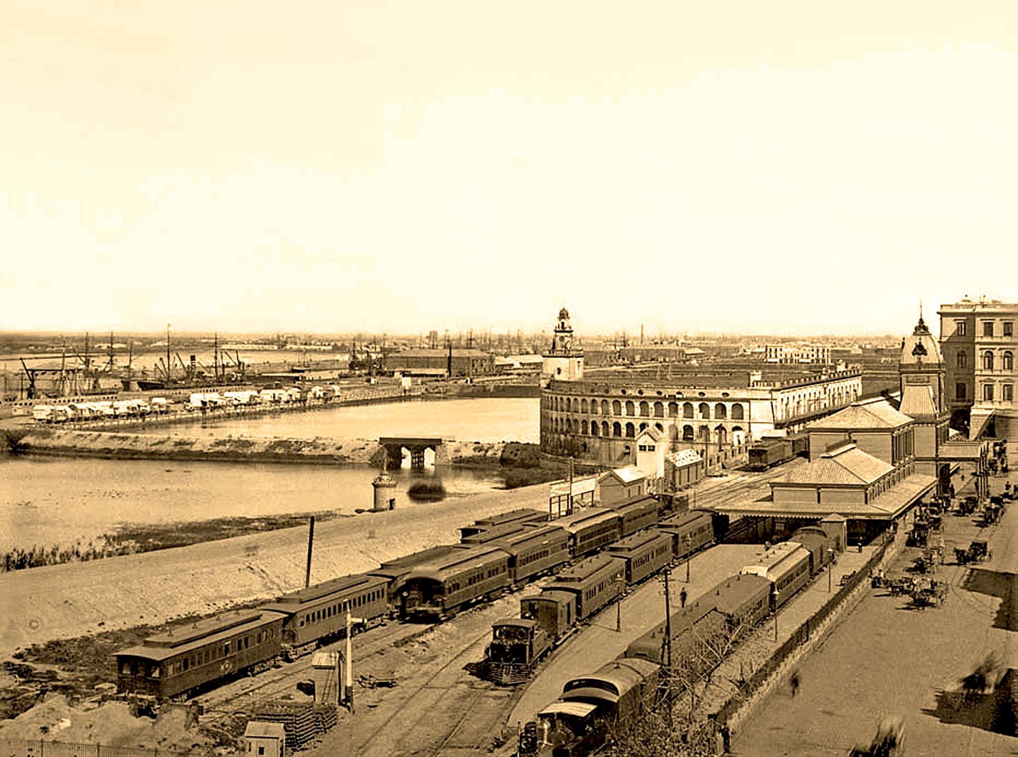 At the beginning of the 1890s, the great Customs House designed by the English architect Edward Taylor on the riverfront, next to the now-demolished Central Station. In the background on the right, the rear section of the Government House. (General Archive of the Nation – AGN).